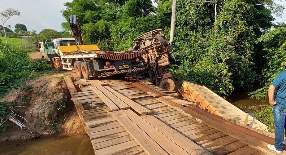 Uma carreta carregada com pedras seguia pela estrada, quando ao passar por uma ponte de madeira, acabou caindo no riacho após a estrutura da ponte não resistir e ceder parcialmente.