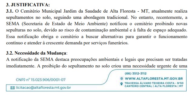 Diante da situação a prefeitura de Alta Floresta publicou o edital do pregão nº 035/2024, para registro de preço para futura e eventual contratação de empresa especializada em serviços de licença prévia e licença de instalação de gaveteiros no cemitério municipal Jardim da Saudade no município.