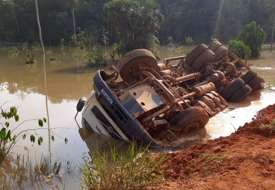 Um caminhão carregado com concreto caiu em um lago, na estrada da “Balsa”, no acesso entre a BR-163 e o bairro Jardim dos Ipês, na manhã desta sexta-feira (17). Segundo o motorista, a estrada cedeu.