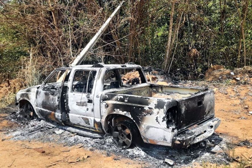 A caminhonete ficou totalmente destruída, às margens da estrada.
