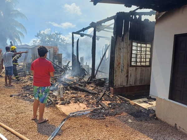 O imóvel foi totalmente destruído pelas chamas. O Corpo de Bombeiros foi acionado e extinguiu o fogo, que ameaçava residências próximas.