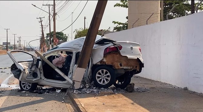 Um grave acidente de trânsito foi registrado neste domingo (14) em Sorriso, envolvendo um veículo Volkswagen Voyage, que colidiu contra um muro e, em seguida, atingiu um poste de energia elétrica. O impacto foi tão forte que o automóvel ficou completamente retorcido.
