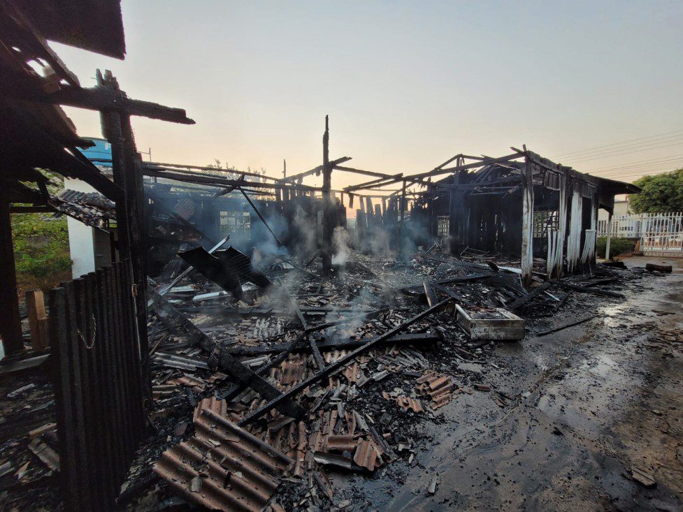 O fogo já havia consumido grande parte da estrutura do telhado e paredes, irradiando do centro para as extremidades.