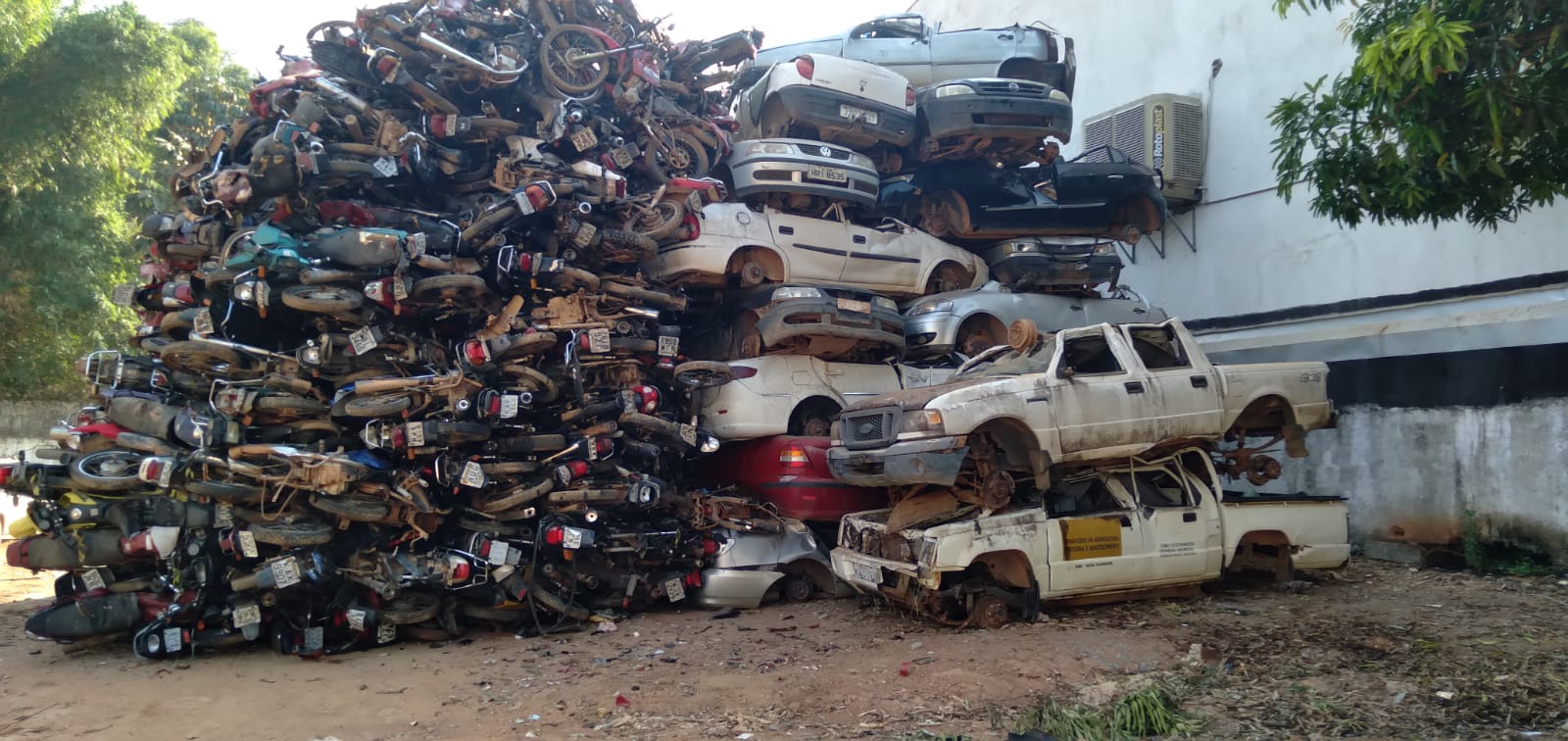 Carros e motocicletas que estão no pátio do 20ª Ciretran de Alta Floresta estão prontos para serem prensados. Segundo Eusébio Cardoso, gerente de pátio da 20ª Ciretran, São 304 veículos entre carros e motos [55 carros e 241 motos] que estão já descontaminados e empilhados no pátio da Ciretran.