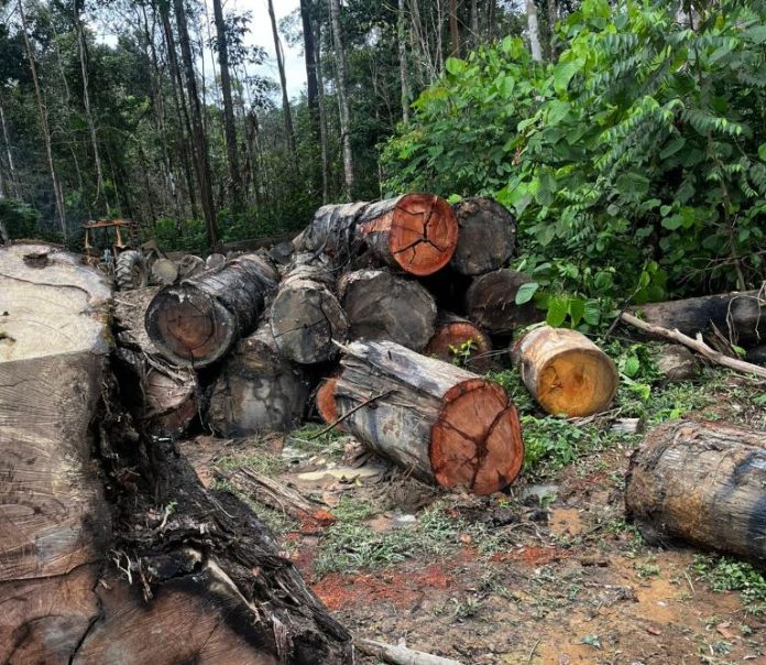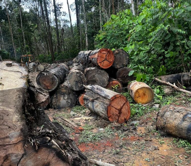 No entorno do local, os fiscais constataram danos severos à vegetação nativa, destruída pela exploração florestal seletiva, com vários troncos de árvores cortadas, prontos para serem transportados, assim como, a criação de trilhas de arrasto (caminhos criados dentro da floresta para arrastar as toras).