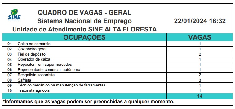Caixa no comércio, cozinheiro geral, operador de caixa, safrista, tratorista agrícola são algumas das oportunidades de emprego nesta semana no Sistema Nacional de Emprego (Sine MT), de Alta Floresta, ao todo são ofertadas 14 vagas em 10 áreas de serviço.