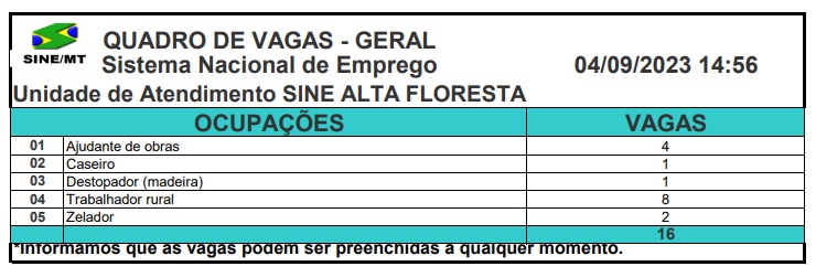 Ajudante de obras, caseiro, destopador, são algumas das oportunidades de emprego nesta semana no Sistema Nacional de Emprego (Sine MT), de Alta Floresta, ao todo são ofertadas 16 vagas em 05 tipos de ocupações.