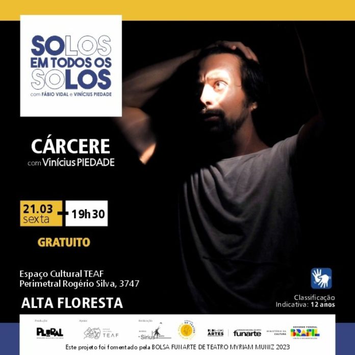 Nesta sexta, 21 de março de 2025, a população de Alta Floresta poderá prestigiar a apresentação da peça teatral “CÁRCERE”, com Vinícius Piedade (São Paulo), às 19h30. A apresentação no Espaço Cultural TEAF e os ingressos são distribuídos gratuitamente uma hora antes do início, devido a limitação de público no Espaço.
