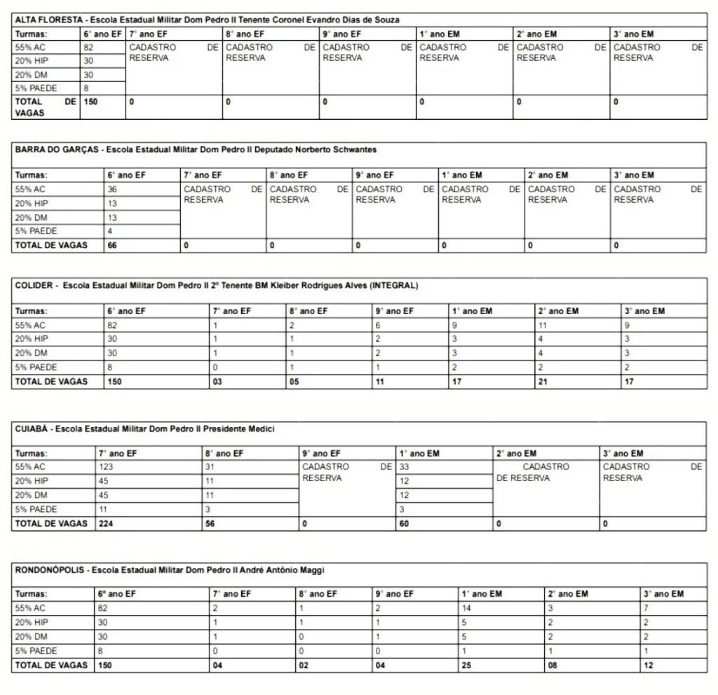 Em Colíder, a Escola Estadual Militar Dom Pedro II 2º Tenente BM Kleiber Rodrigues Alves oferece 224 vagas. Já em Cuiabá, a Escola Estadual Militar Dom Pedro II Presidente Médici conta com 340 vagas. Por fim, em Rondonópolis, a Escola Estadual Militar Dom Pedro II André Antônio Maggi disponibiliza 205 vagas. Outras informações sobre o processo seletivo estão disponíveis aqui.
