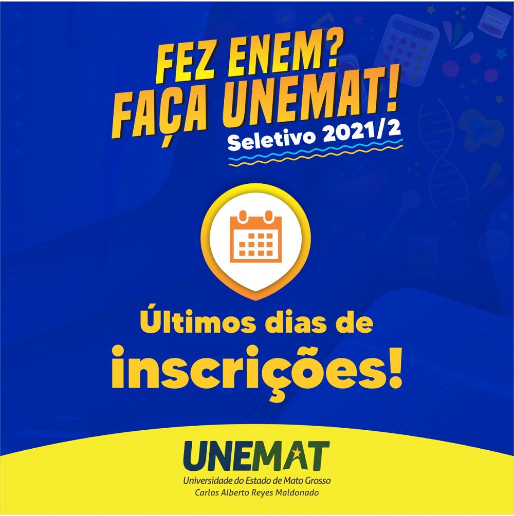 Neste domingo (8) encerram as inscrições para o Processo Seletivo 2021/2, para ingresso na Universidade do Estado de Mato Grosso (Unemat) no segundo semestre deste ano. Esta edição oferta 2.570 vagas em 62 cursos, distribuídos em 12 municípios do Estado.