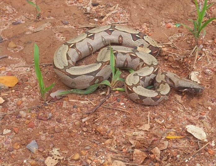 No local, que estava em obras, a jiboia foi encontrada ao lado das ferragens que estavam no terreno, o animal se apresentava saudável e media cerca de 50cm.