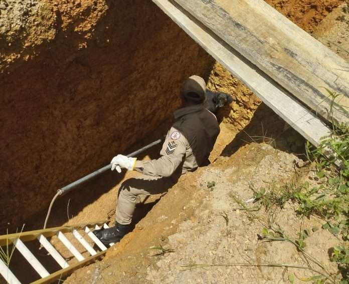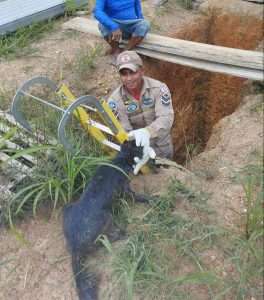 No local, a equipe encontrou o animal em um buraco aproximadamente de três metros de profundidade, onde com a utilização de uma escada e o cambão foi retirado o animal sem ferimentos.
