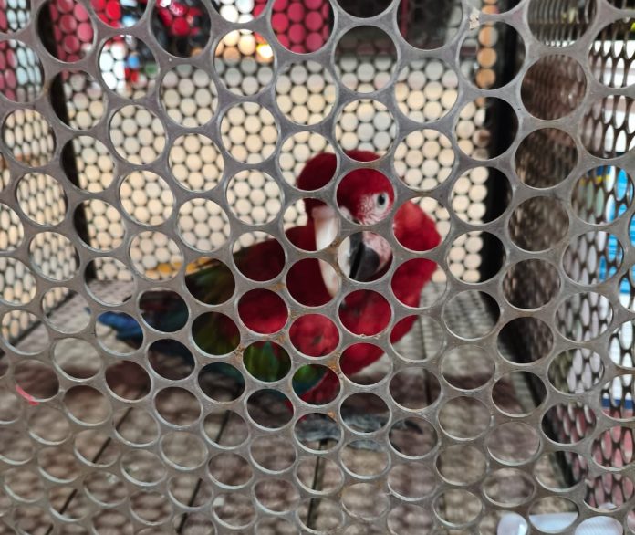 O animal apresentava lesão visível na asa, dificultando seu voo e deslocamento. Ao chegar no local, foi realizado o resgate da Arara de forma segura, utilizando os equipamentos de proteção individual e de contenção adequados.