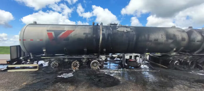 Um caminhão-tanque que estava carregado de etanol pegou fogo na manhã de ontem sábado (6) na BR-163, próximo ao município de Sorriso, a 420 km de Cuiabá. A concessionária responsável pela rodovia informou que o motorista do veículo não teve ferimentos graves e dispensou atendimento médico.