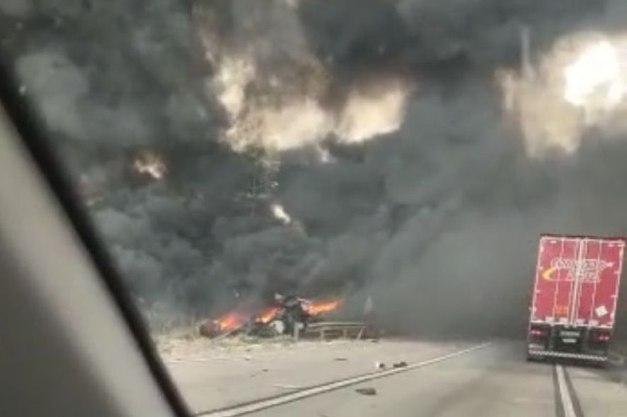 A colisão envolveu dois veículos de carga, um deles carregado de combustível, o que acabou causando um grande incêndio com fumaça densa.