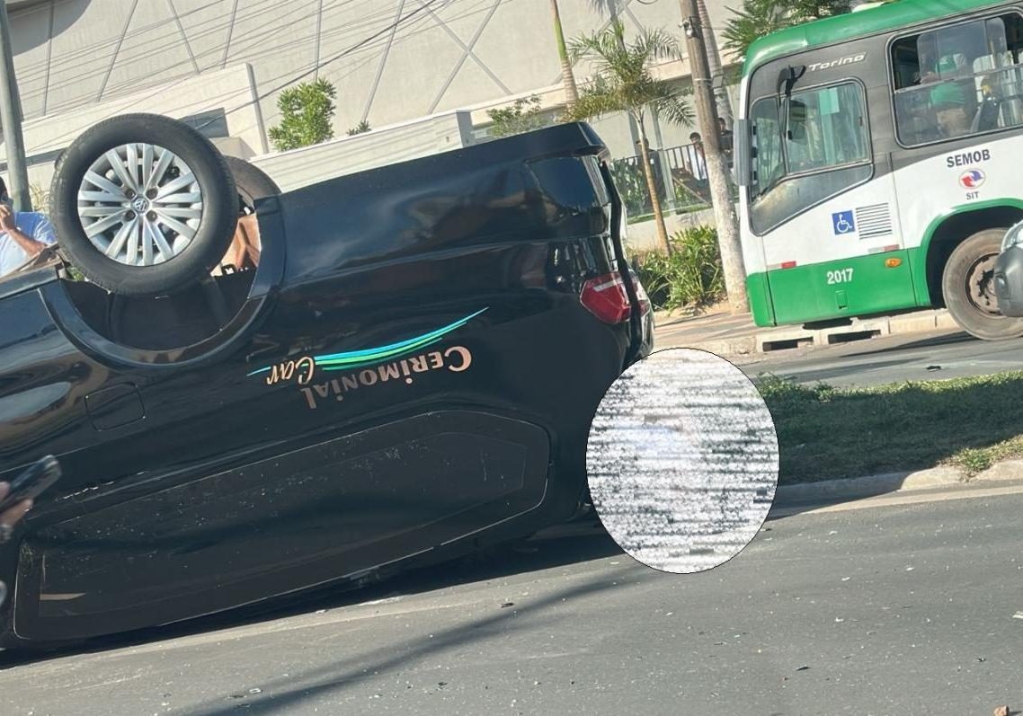 Um acidente inusitado chamou a atenção de motoristas e pedestres na tarde deste sábado (17), na Avenida Fernando Corrêa da Costa, uma das principais vias de Cuiabá. Um carro de uma empresa funerária capotou no canteiro central, deixando o corpo que era transportado parcialmente exposto na via.