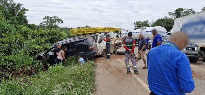 Ainda conforme o relato, um quarto veículo envolvido — uma carreta Mercedes-Benz 2548 branca — saiu da pista ao tentar evitar a colisão com os demais veículos, parando sobre a faixa de domínio da rodovia.