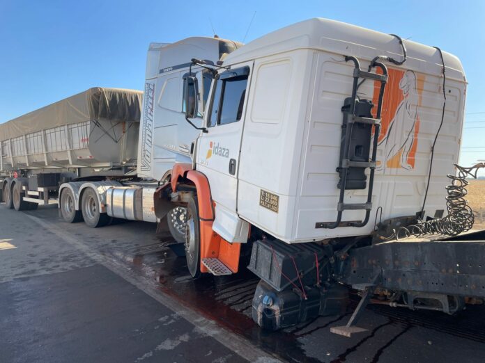 As carretas ficaram sobre a pista. Os veículos que trafegavam pela rodovia seguiram viagem pela faixa de domínio