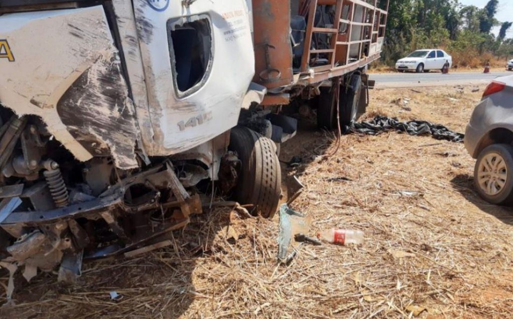 Já o caminhão, causou danos na lateral esquerda e, com o impacto, a roda foi empurrada para trás.