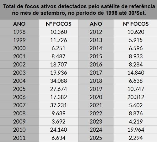 Mato Grosso encerrou o mês de setembro com o menor número de focos de calor já registrado desde o início da série histórica do Instituto Nacional de Pesquisas Espaciais (Inpe/BD Queimadas), iniciada em 1998. Foram contabilizados 2.294 focos no período, superando o recorde anterior de 3.692 ocorrências registrado em 2009, valor que também corresponde à média histórica para o mês. Veja os registros de 1998 a 2025 ao final da matéria.