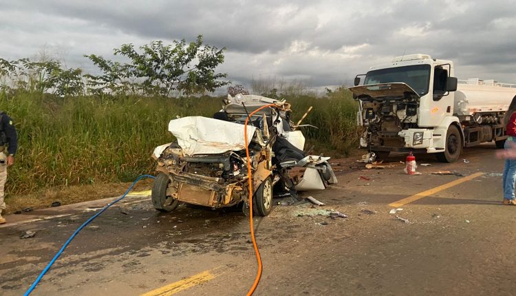 A polícia informou que o carro de passeio também estava parado atrás dessa segunda carreta quando o caminhão-tanque, com placa de Matupá, não freou a tempo, bateu atrás do carro e o prensou contra a carreta da frente.