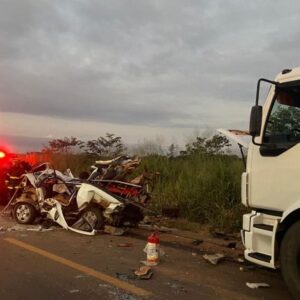 Uma mulher morreu e o marido ficou ferido em um engavetamento na BR-163 na tarde de ontem quarta-feira (4). O carro de passeio em que estavam foi prensado entre uma carreta e um caminhão-tanque no km 873 da rodovia federal, sentido Sinop/Itaúba.