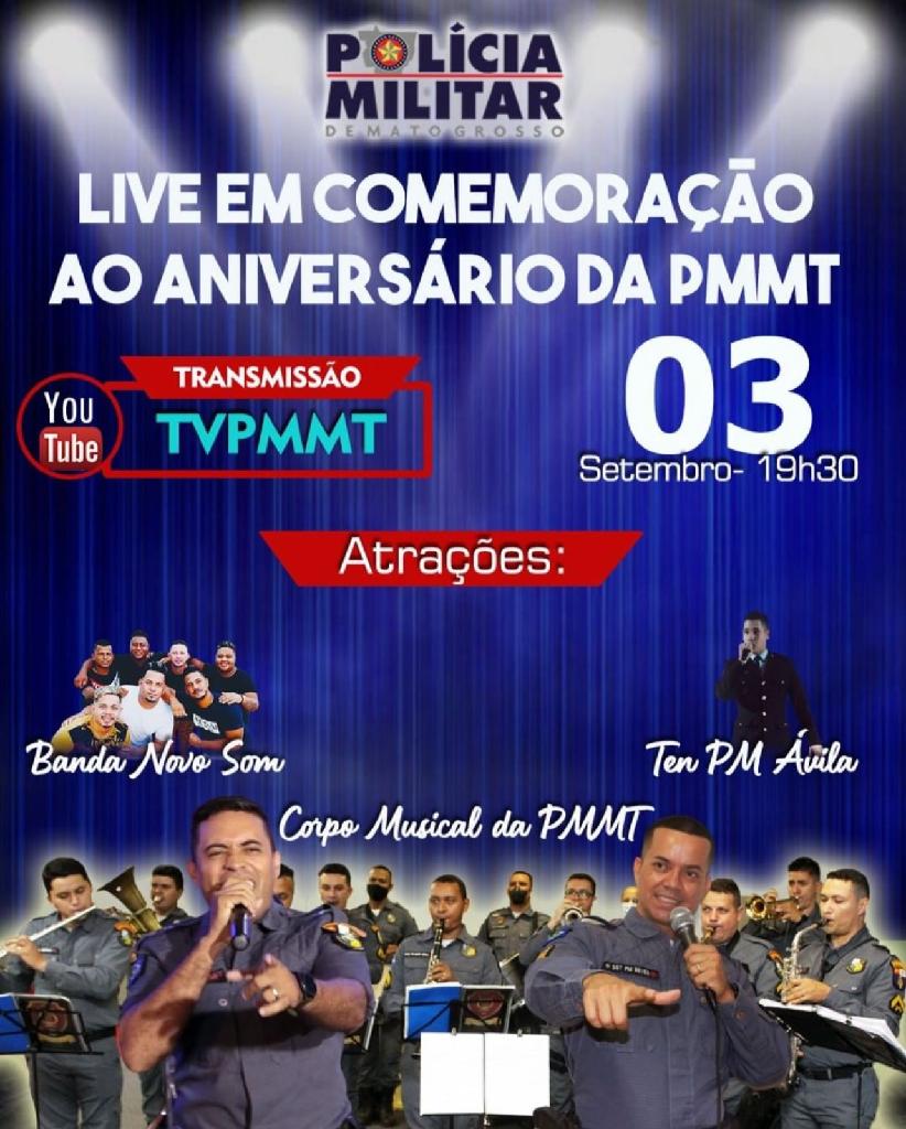 Nesta sexta-feira (03.09), a partir das 19h, a Polícia Militar vai realizar uma live comemorativa em alusão aos 186 anos da instituição, comemorados no dia 05 de setembro. O evento contará com a participação do Corpo Musical da PM e convidados. A live de aniversário será transmitida pelo canal da PMMT no Youtube e também nas redes sociais.