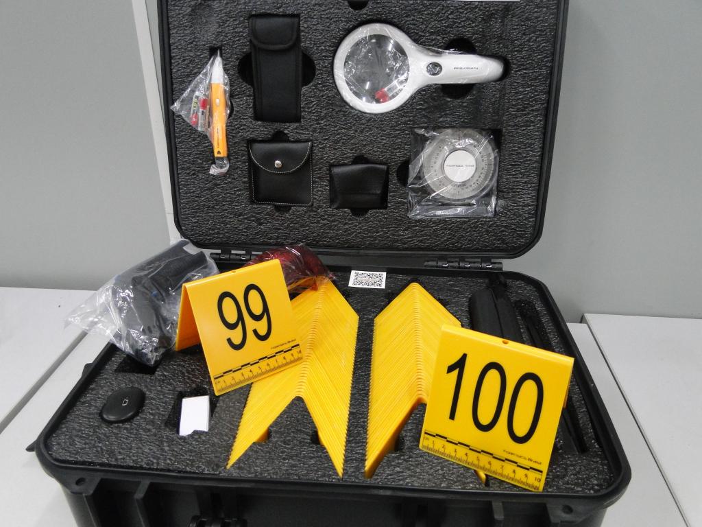 A maleta contém onze itens, sendo eles: conjunto de placas para fixação de vestígios, detector de tensão de cabos energizados tipo caneta sem contato, emissão de radiação portátil para análise de trajetória balística, luzes forenses para busca de vestígios biológicos, lupa de mão com LED, lupa conta-fios, paquímetro digital, régua para fotografia de evidência, trena a laser, inclinômetro, amperímetro.