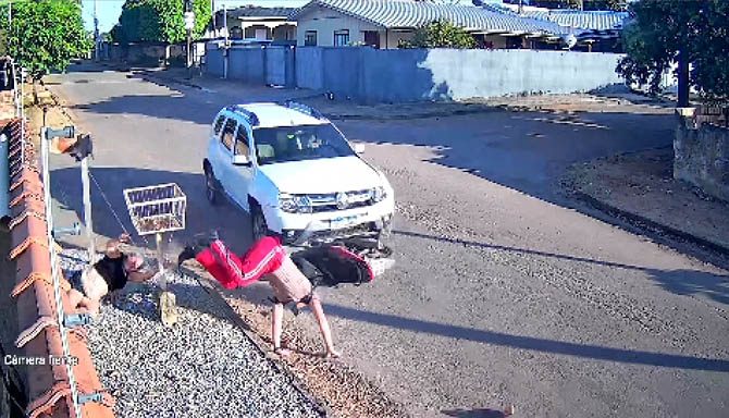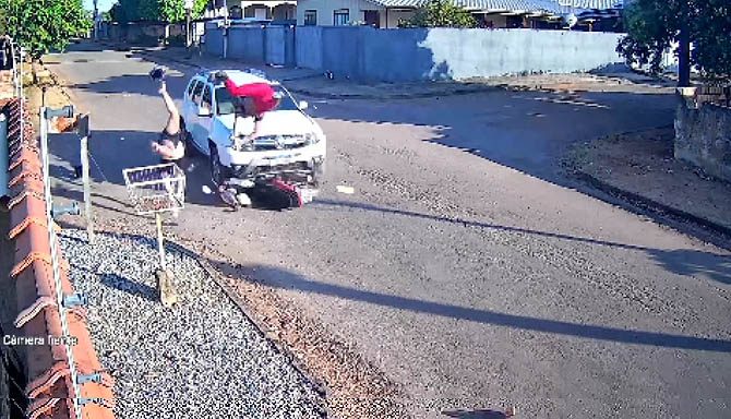Um acidente de trânsito foi registrado por volta das 07h15 de hoje, terça-feira (12), na rua Goiás, bairro Cidade Alta, envolvendo uma motoneta ocupada por um menor de 16 anos e uma mulher de 48 anos e uma Duster. Câmeras de segurança registraram o momento do impacto.