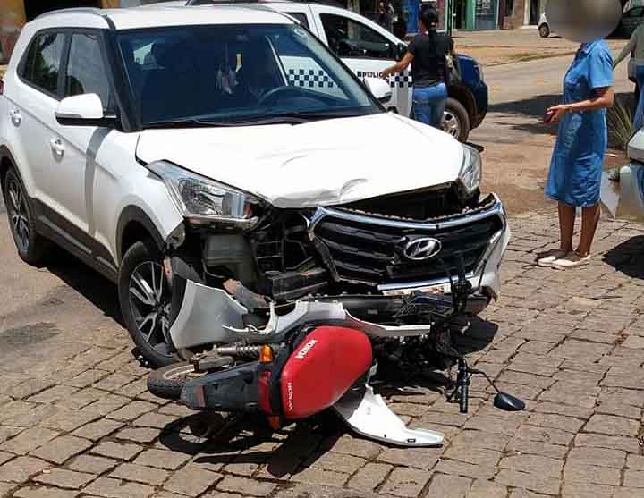 A condutora da Hilux informou a PM que estava parada na rua D-5 esperando para entrar na avenida “D”, quando o veículo Creta, que estaria vindo na avenida D sentido Perimetral/Centro deu seta para estar entrando na rua D-5 e ao realizar a manobra, a motocicleta Pop conduzida pelo menor que vinha na avenida D sentido Centro/Perimetral acabou colidindo no veículo, fazendo com que o condutor da moto fosse arremessado contra o seu veículo (Hilux) que teve danos no para-brisa e na lateral central.