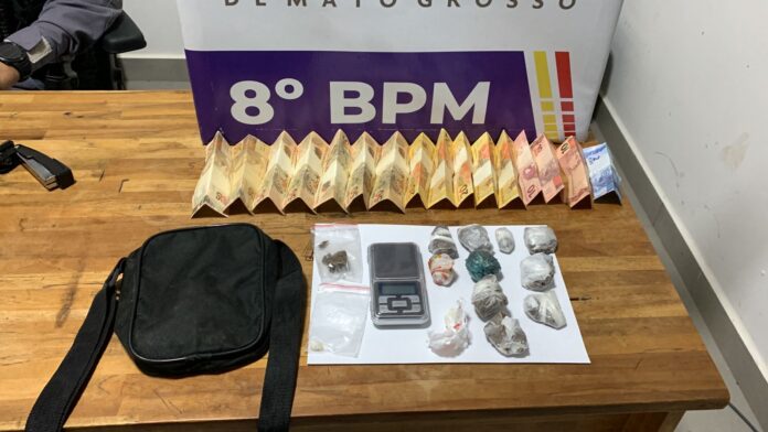 No local, foi encontrada em cima de um armário, uma balança de precisão e em uma mochila com roupas foi encontrada uma porção aparentando ser maconha e uma porção aparentando ser pasta base de cocaína.