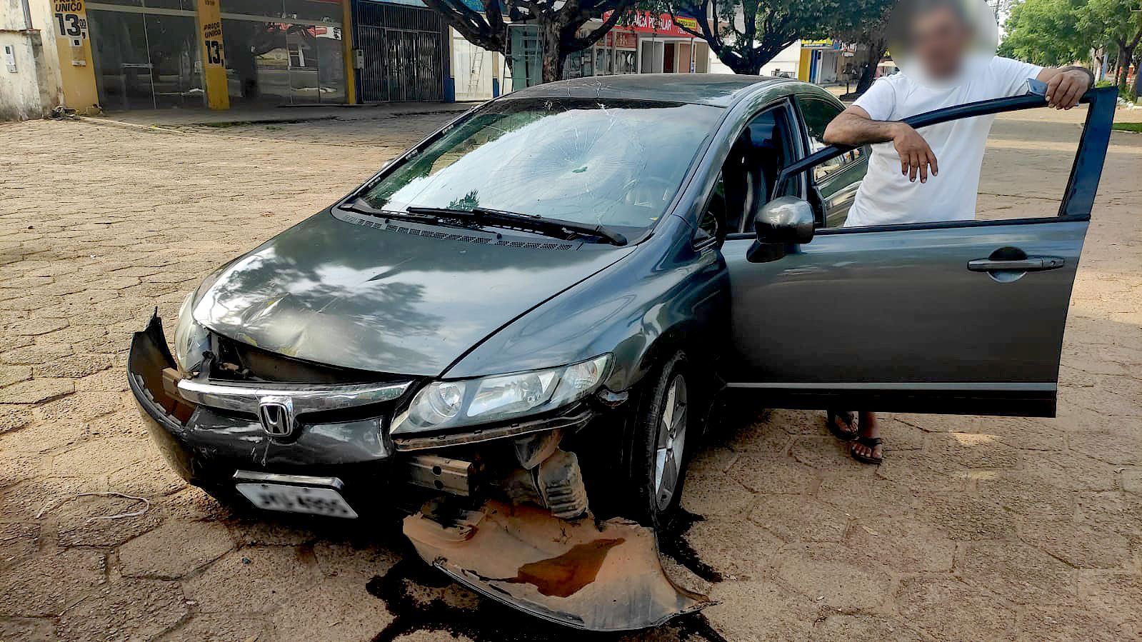 Uma equipe da PM se deslocou ao local e identificou os danos materiais e foi informada que o automóvel, um Honda Civic, cinza, ano 2007, com placas de Vera/MT e que ocasionou o acidente estava parado na calçada, logo mais à frente.