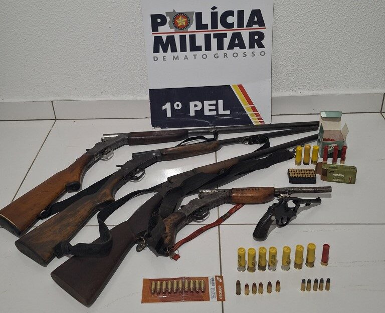 Conforme ocorrência, em diligências na zona rural e realização de estudo de situação em cumprimento do mandado de reintegração de posse com o apoio do oficial de justiça, a equipe localizou em uma das propriedades rurais uma espingarda cano cerrado calibre 32, um revólver calibre 32 e uma espingarda calibre 20.