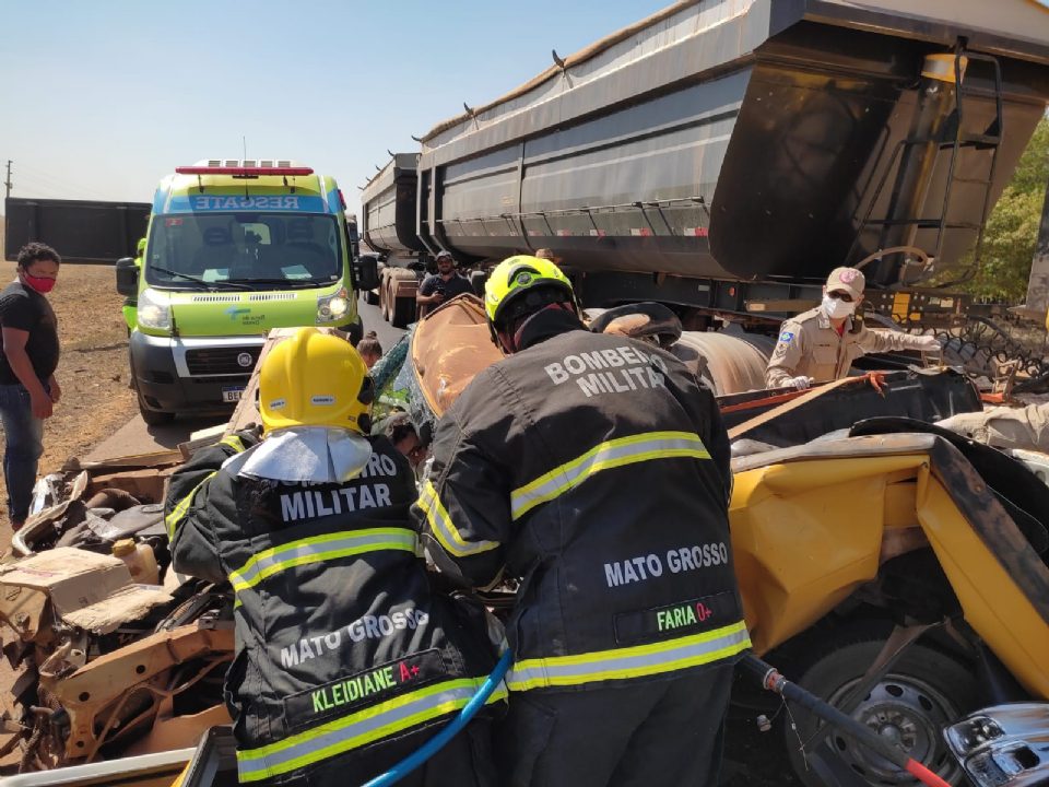 O acidente aconteceu por volta das 13h30 no sentido a cidade de Sorriso. De acordo com o Corpo de Bombeiros, a picape ficou parcialmente prensada pelo caminhão e o motorista preso às ferragens.