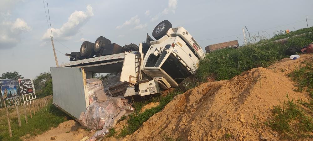 Conforme ocorrência registrada, um caminhão Cargo, 1722, branco, baú, carregado com cortes de frango, tombou ao passar pelo “Trevo do Piovesan”, o veículo foi carregado em Cuiabá e seria descarregado em Alta Floresta.
