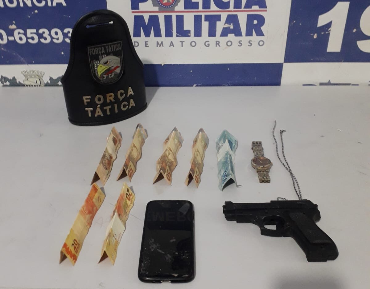 A dupla foi abordada e na checagem foi constatada que a suspeita tinha em seu desfavor um mandado de prisão em aberto e o suspeito portava um simulacro de arma de fogo, bem como, R$ 340 reais e um celular.