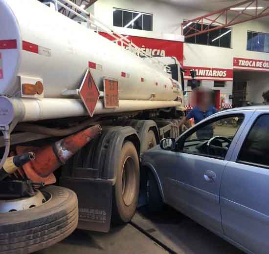 Um caminhão-tanque acabou batendo em um carro que estava estacionado em um posto de combustível de Colíder, na tarde de ontem sexta-feira (11).