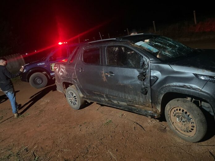 Um Fiat Strada acabou capotando próximo à ponte do rio Carapá, em Colíder, na estrada Saltinho, na noite desta sexta-feira (26).