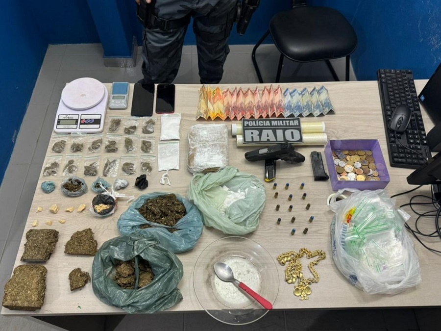 Em buscas no quarto do suspeito, os militares encontraram um tablete de cocaína e porções da mesma droga, além de um carregador de pistola de calibre .9mm contendo 10 munições.