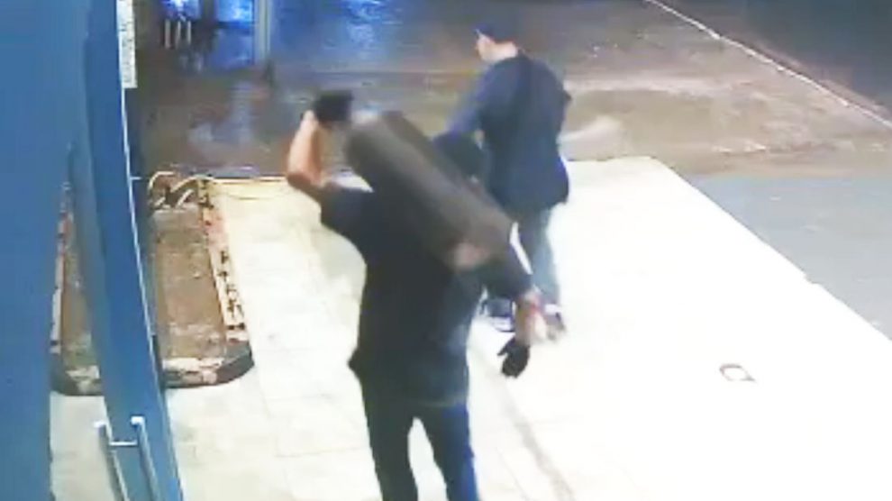 A unidade agência não tem vídeo monitoramento, mas as câmeras de segurança de uma empresa registram dois homens com roupas pretas — um deles carregando um cilindro possivelmente de oxigênio para ajudar cortar os caixas.