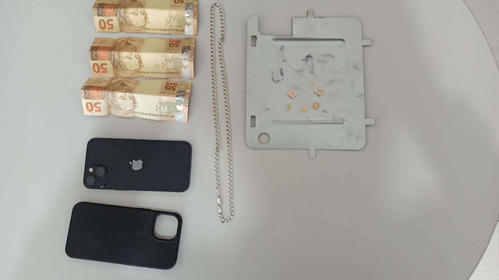Ao receber ordem de prisão, tentou fugir a pé, sendo contido. Em busca pessoal e na capa do seu celular foram encontrados R$150,00 (cento e cinquenta reais), sendo três cédulas de R$ 50.00 reais