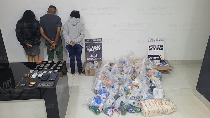 cesta básica e droga apreendida, trio preso
