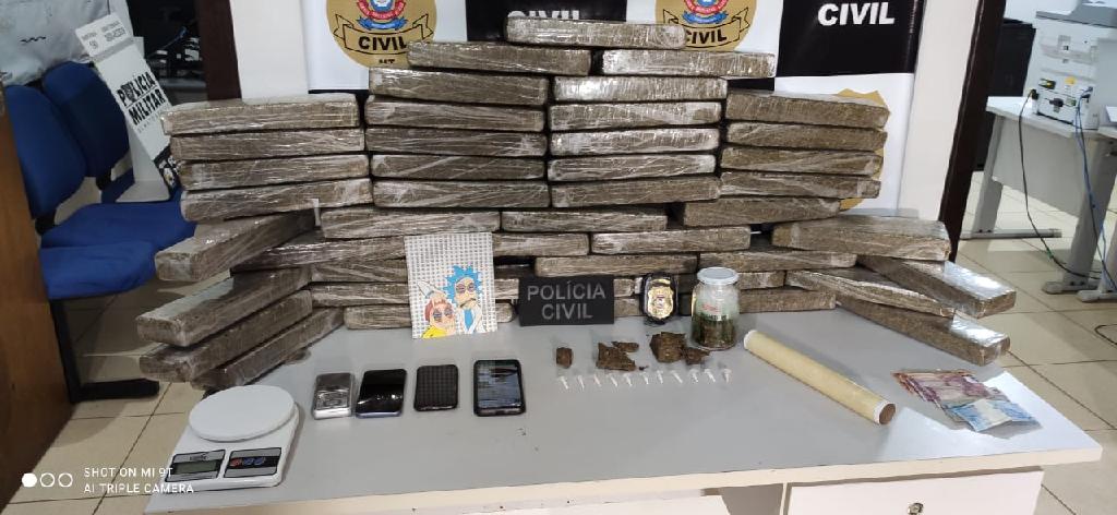 Além da grande quantidade totalizando 43 quilos maconha, foram apreendidas 11 porções de cocaína, um cartela de LSD, balanças de precisão, entre outros materiais.