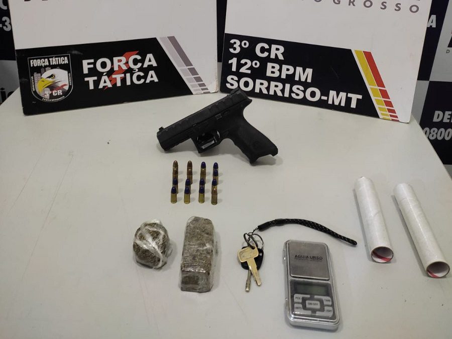 Policiais militares do 12º Batalhão prenderam em flagrante uma mulher de 44 anos por tráfico de drogas e porte ilegal de arma de fogo, na tarde de ontem quinta-feira (27.07), em Sorriso. Com a suspeita, a PM apreendeu porções de maconha e uma pistola, que teria sido utilizada em uma tentativa de homicídio na cidade.