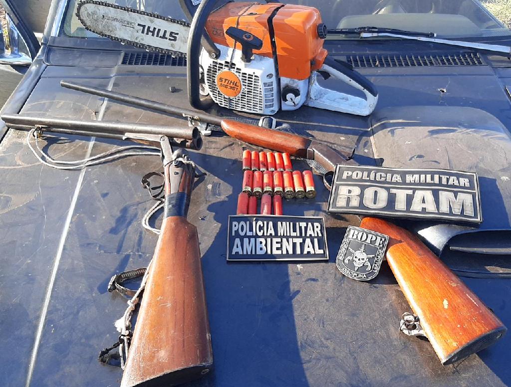 Policiais militares do Batalhão de Proteção Ambiental prenderam um homem de 43 anos por crime ambiental e posse irregular de arma de fogo, na última quinta-feira (11.08), em Juara. Duas espingardas, 17 cartuchos de arma de fogo e uma motosserra foram apreendidos na ação.