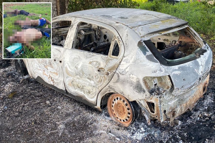 Próximo aos corpos, os PMs ainda localizaram um veículo Gol branco carbonizado.