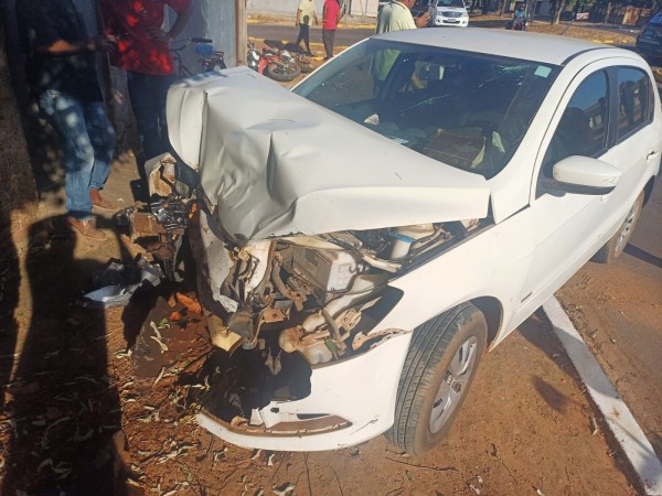 O acidente envolveu uma picape Fiat Strada, um VW Voyage e uma moto Honda Brós.