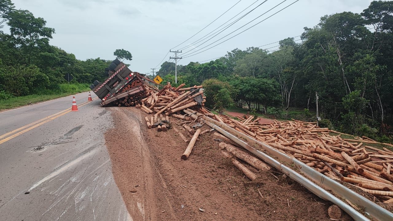 O veículo transportava madeira, que ficou espalhada sobre a pista e também na faixa de domínio, provocando lentidão no tráfego até que a remoção do material aconteça.