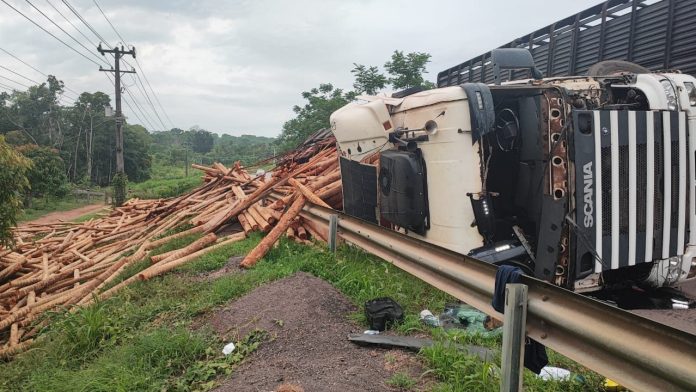 O veículo transportava madeira, que ficou espalhada sobre a pista e também na faixa de domínio, provocando lentidão no tráfego até que a remoção do material aconteça.