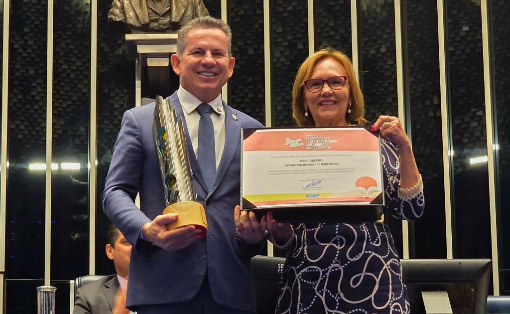 O governador Mauro Mendes foi homenageado nesta segunda-feira (13), em sessão solene no Senado Federal, com a comenda “Governadores pela Alfabetização das Crianças na Idade Certa”.